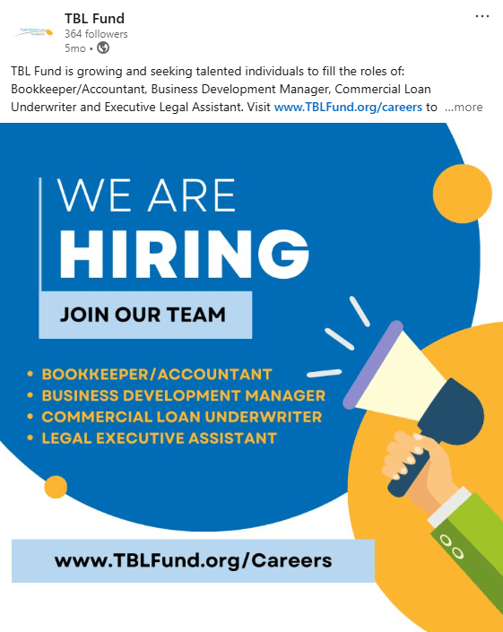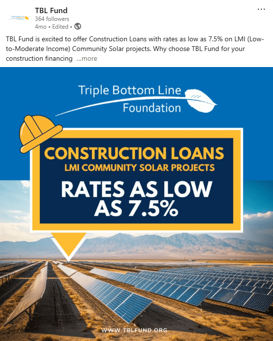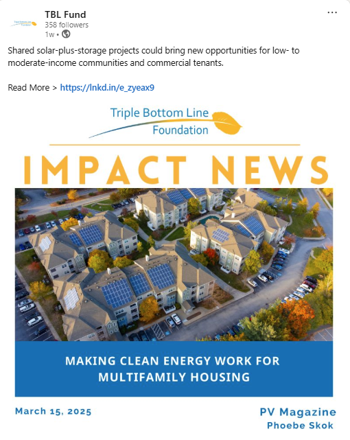 When I joined TBL Fund, the organization had a brand-new LinkedIn page and an ambitious goal: increase visibility in the clean energy finance space while building credibility with mission-aligned partners. I led the development of a social media strategy that prioritized professional tone, visual consistency, and actionable messaging. The campaign served two core purposes: (1) establish the TBL Fund brand as a trusted financing resource for clean energy solutions, and (2) steadily grow an audience of developers, nonprofits, and industry peers.